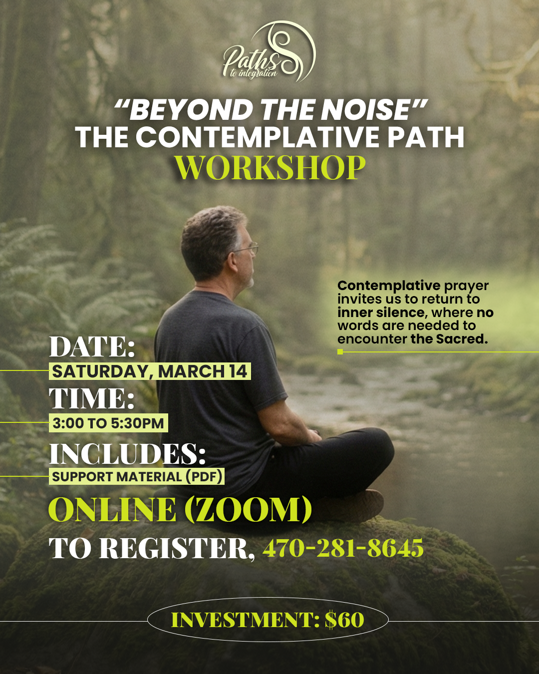 Online Herb Shop & Healing Center 161 Jackson Street, Canton, GA 30115 We live surrounded by noise, constant thoughts, and external demands. Contemplative prayer invites us to return to ilnner silence, where no words are needed to encounter the Sacred. Date: Saturday, March 14, 2026 Time: 3:00 to 5:30pm Investment: $60 Includes: Workshop support material (PDF) To register, call the Herb Shop & Healing Center 770-704-9950 For more information, text: 470-281-8645