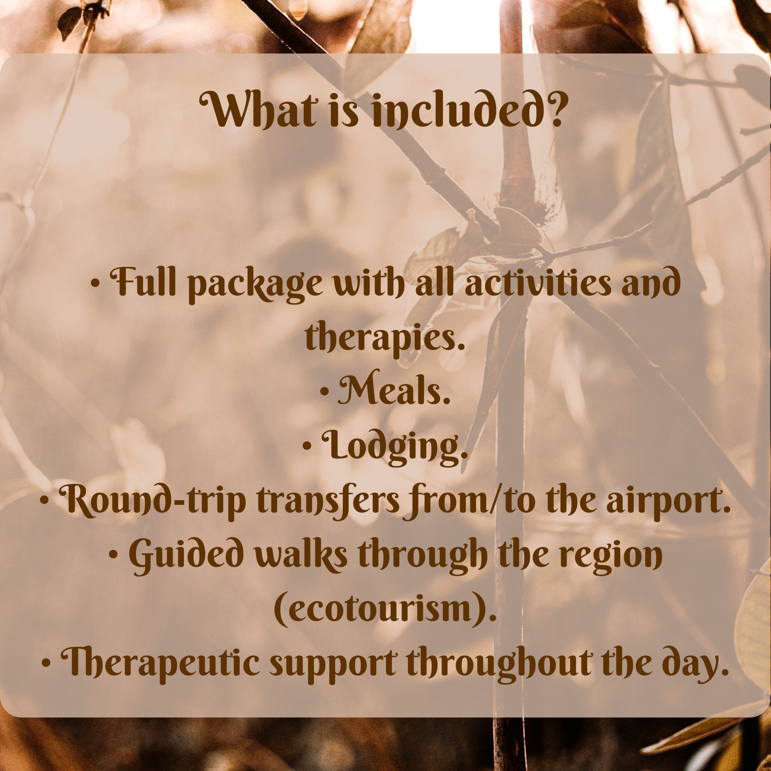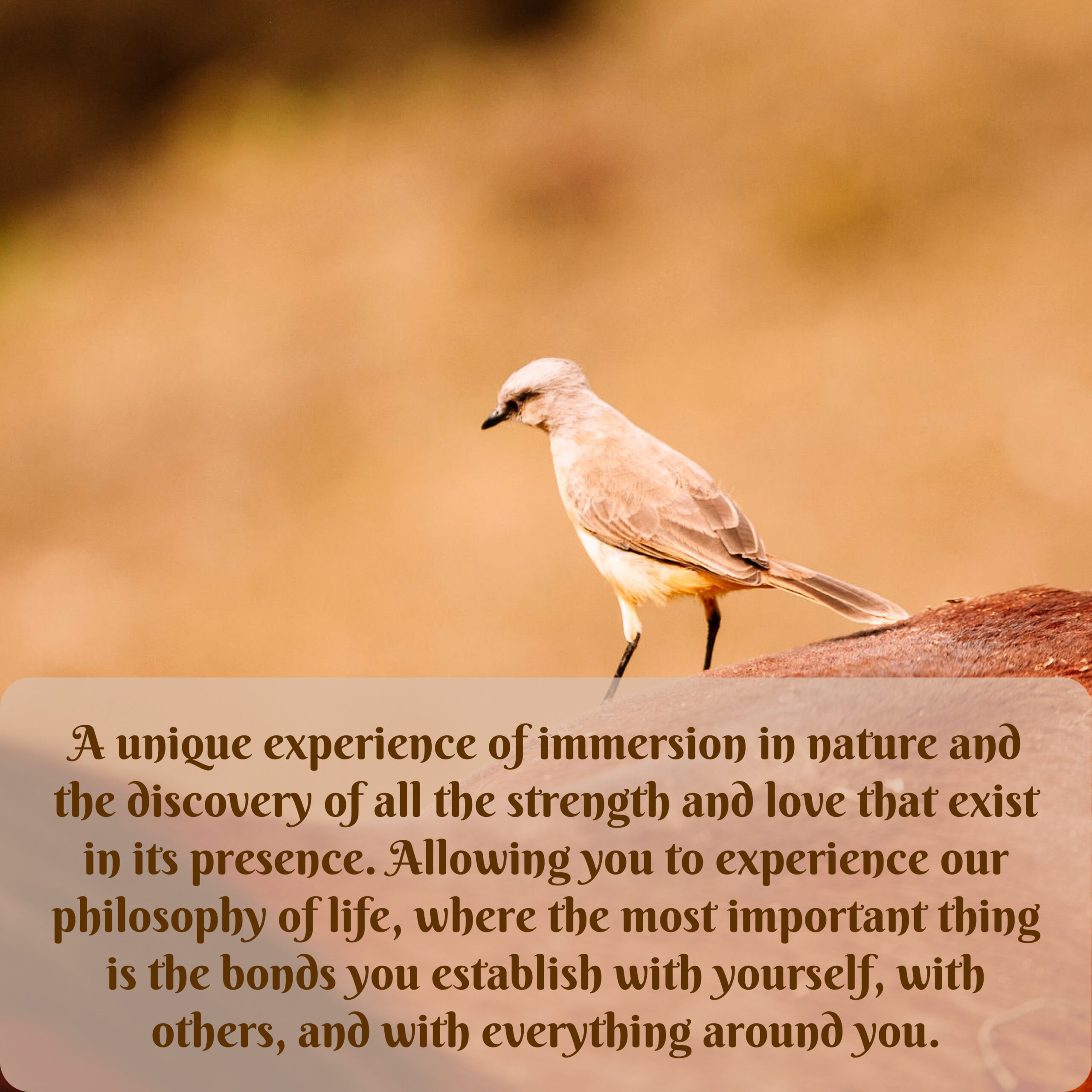Una experiencia única de inmersión en la naturaleza y de descubrir toda la Fuerza y el Amor que en ella mora, permitiéndote experimentar nuestra filosofía de vida, donde lo más importante son los vínculos que logras establecer contigo mismo, con los demás y con todo aquello que te rodea.