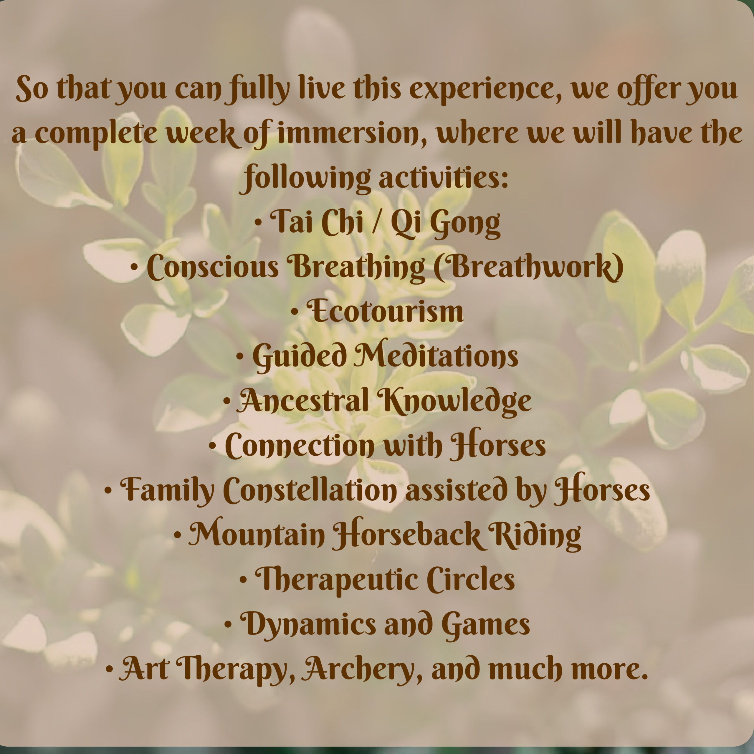 En una sinergia maravillosa junto al Tai Chi y el Chi Kung ofrecemos Terapias Holísticas y La Experiencia Terapéutica con los Caballos, dirigida por expertos en el área como lo son Israel Sanz y Mary Brady. Por medio de estas prácticas, los participantes tendrán la oportunidad única de participar en Constelaciones Familiares Asistidas por Caballos, Danzas Circulares, Ejercicios de Terapia Gestalt y Paseos Sensoriales. Estas actividades están diseñadas para promover la armonía emocional, mejorar las conexiones interpersonales y fomentar una comprensión más profunda de uno mismo.