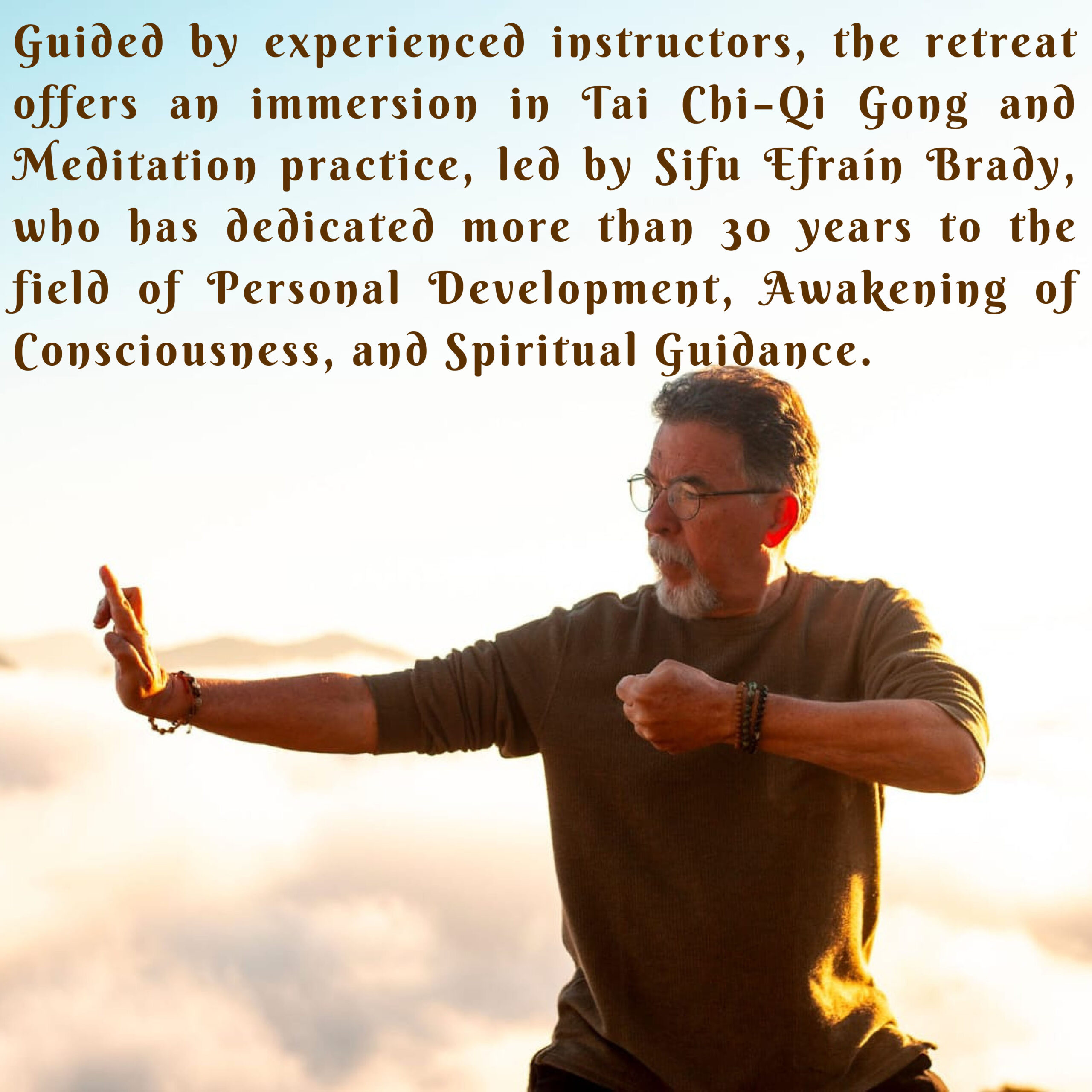 Dirigido por instructores experimentados, el retiro ofrece una inmersión en la práctica del Tai Chi-Qi Gong y Meditación, de la mano del Sifu Efrain Brady, lo que permite profundizar en estas prácticas mientras se sintoniza con la Energía de la Naturaleza y el ambiente sereno de Campo Redondo.