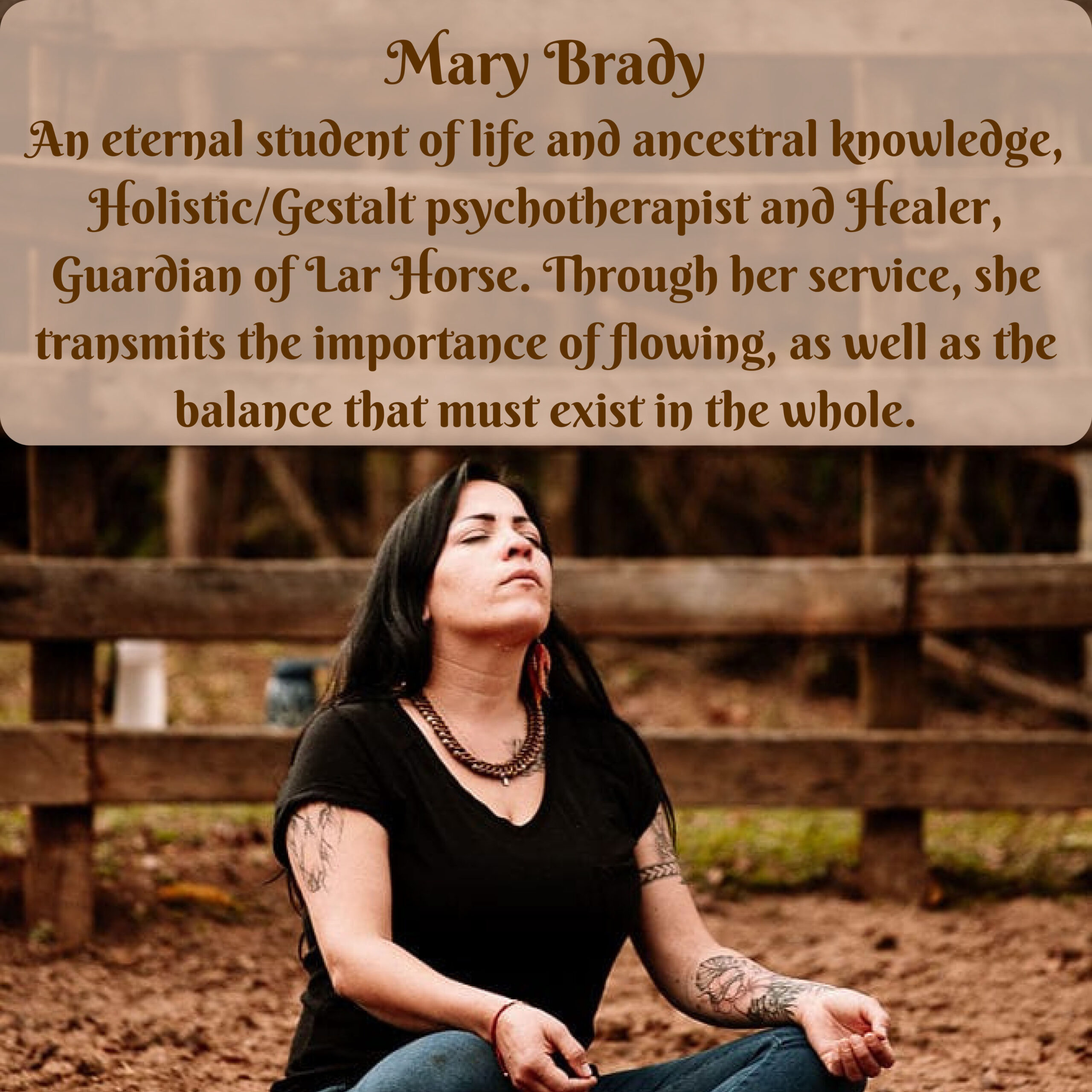 Mary Brady: Amante de la naturaleza y Saberes Ancestrales, Bailarina, Psicoterapeuta Holística/Gestalt, nos trae a través de su servicio la importancia del fluir, así como el equilibrio que debe existir en un todo.
